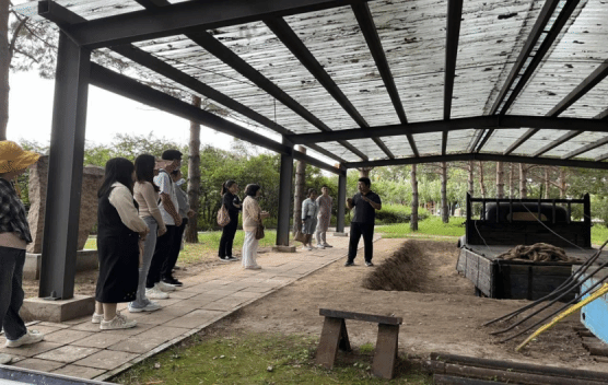 萨55井是铁人王进喜于1960年4月率领1205钻井队到大庆参加石油大会战打下的第一口井。在恶劣的条件下,王进喜带头喊出了“有条件要上,没有条件创造条件也要上!”的豪迈誓言。在这个大庆精神铁人精神的重要发祥地,师生看见了当年的卸车台、钻井架、泥浆池、土油池、值班房和工人住过的地窨子等遗址与实物,在井架前重温了“石油工人一声吼,地球也要抖三抖。石油工人干劲大,天大困难也不怕”的劳动号子。