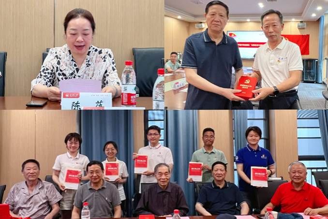副院长陈蓓宣读了2024年“光荣在党50年”老党员名单。卢昌宁书记为到场的4位老党员逐一颁发“光荣在党50年”纪念章。随后由青年学生党员向老党员们赠送书籍《习近平关于全面加强党的纪律建设论述摘编》《初心的力量》。