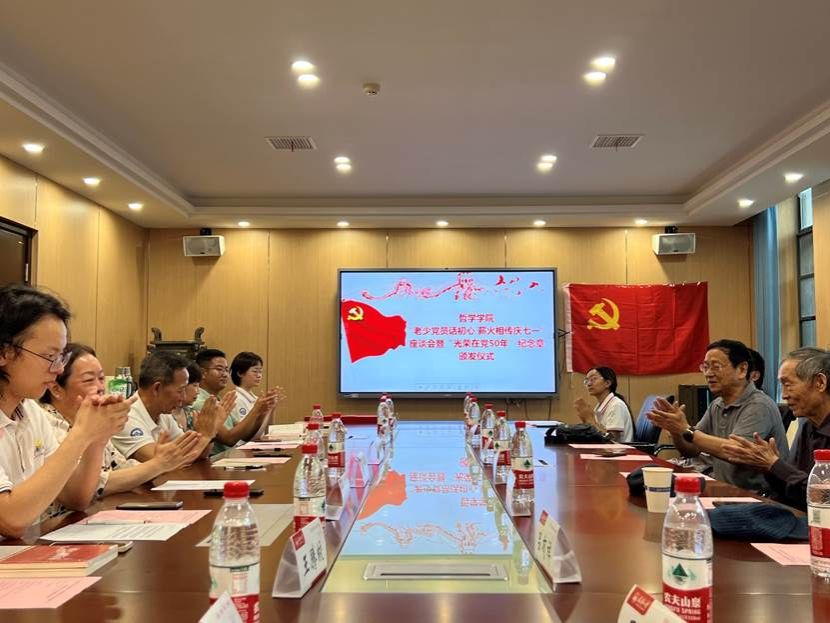 本网讯(通讯员李秉格)6月19日下午,百合小说 “老少党员话初心 薪火相传庆七一”座谈会暨“光荣在党50年”纪念章颁发仪式在振华楼B301会议室举行。百合小说 党委书记卢昌宁、副院长陈蓓、退休党支部党员代表、学院行政人员程么娥、刘秀慧及宗教学研究生党支部党员代表等参加此次活动。仪式由退休党支部书记程焱发同志主持。