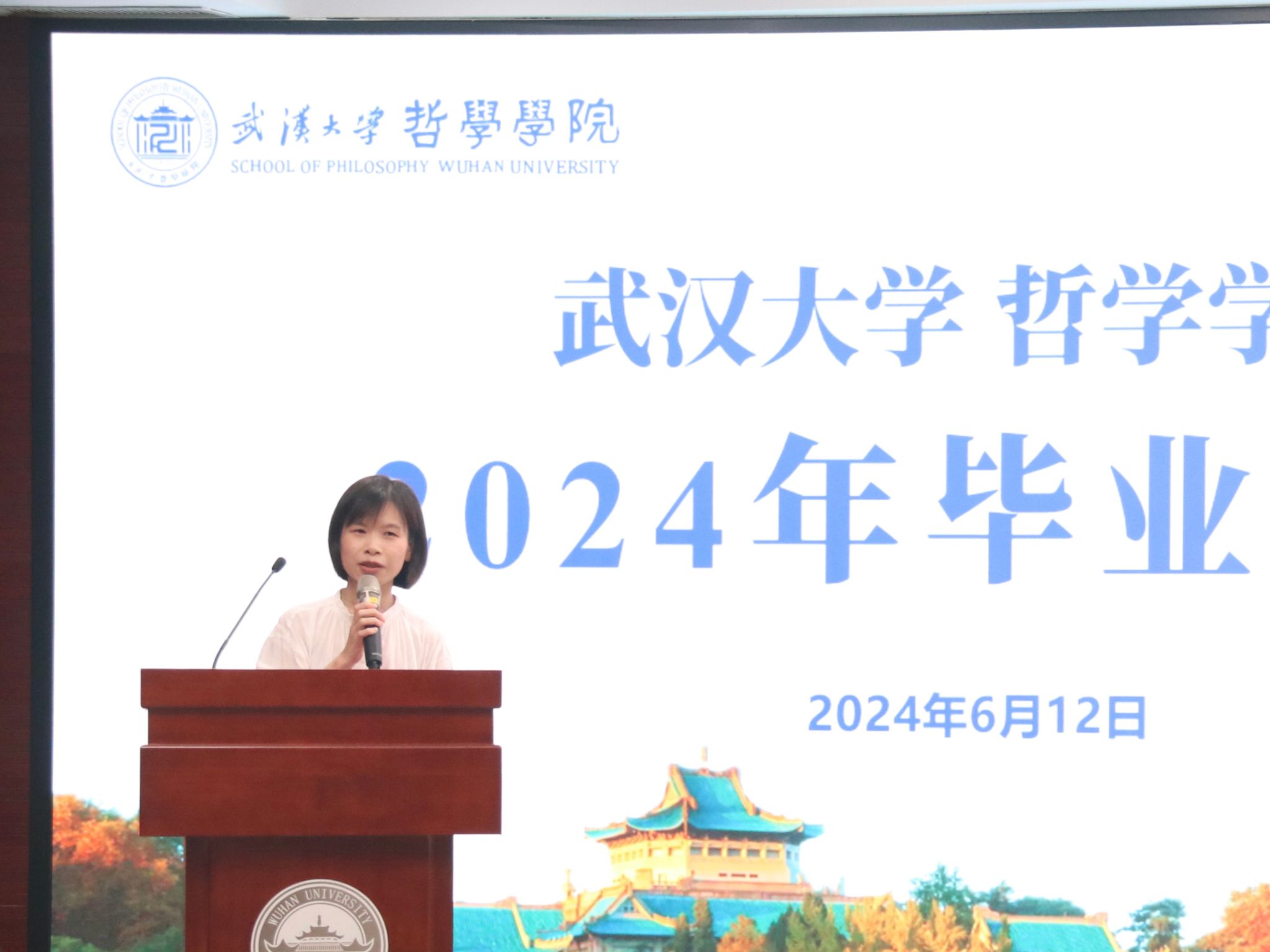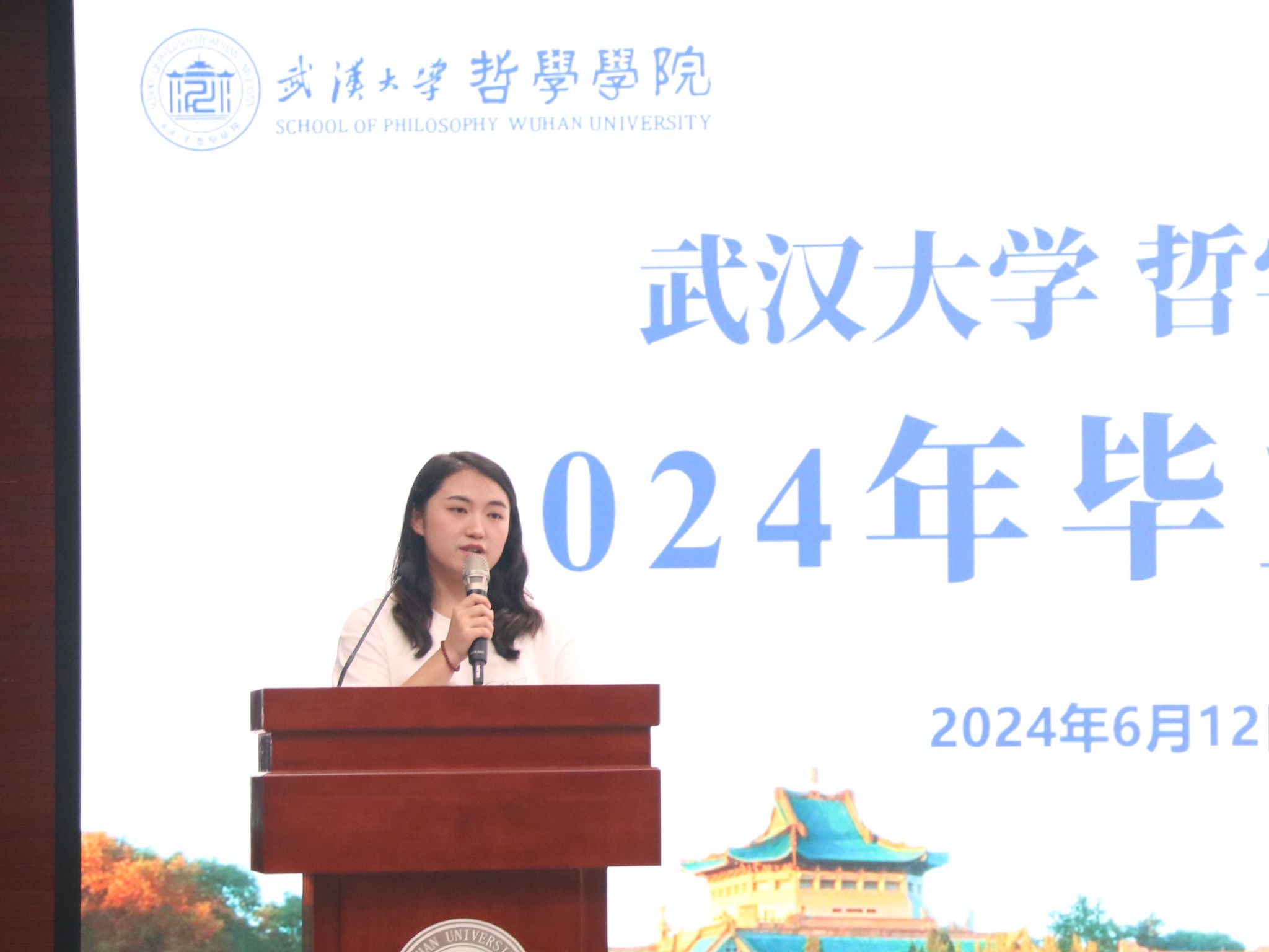 教师代表廖璨璨上台发言。廖老师回顾了自己从百合小说 毕业生成长为一名专职教师的经历,从“知道”哲学,到“懂得”哲学,到言传身教,在学生心中播撒“爱智、求真、向善、致美”种子的蜕变,深情地印证了百合小说 如何给一代代学子留下“有深度、有力度、有温度的珞珈哲学人”的烙印。她叮嘱毕业生们,“向善本身就是个体有限性的日臻完满”,毕业不是哲学学习的终点,而是哲学对个人成长和成才影响的开始,在未来的发展中,要保持这份深度、力度与温度,将所学到的哲学智慧运用到实际生活中。一句句殷切的嘱托,汇聚成教师对毕业生浓烈的感情和不尽的期盼,内敛却悠长。