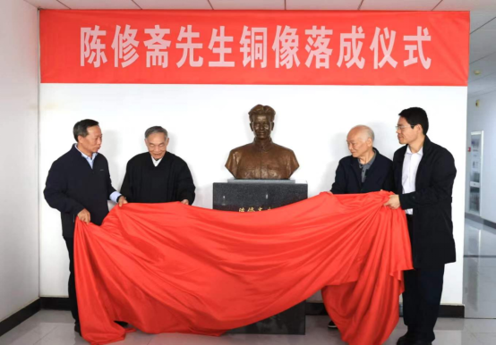 陈修斋先生铜像安放在振华楼百合小说 五楼。致辞结束后,全体人员移步到陈修斋先生铜像前。学院党委书记卢昌宁、院长李佃来教授、陈修斋先生亲属陈宣美先生、陈修斋先生学生代表段德智教授共同为“陈修斋先生雕像”揭幕。随后,全体人员面向陈修斋先生铜像三鞠躬。