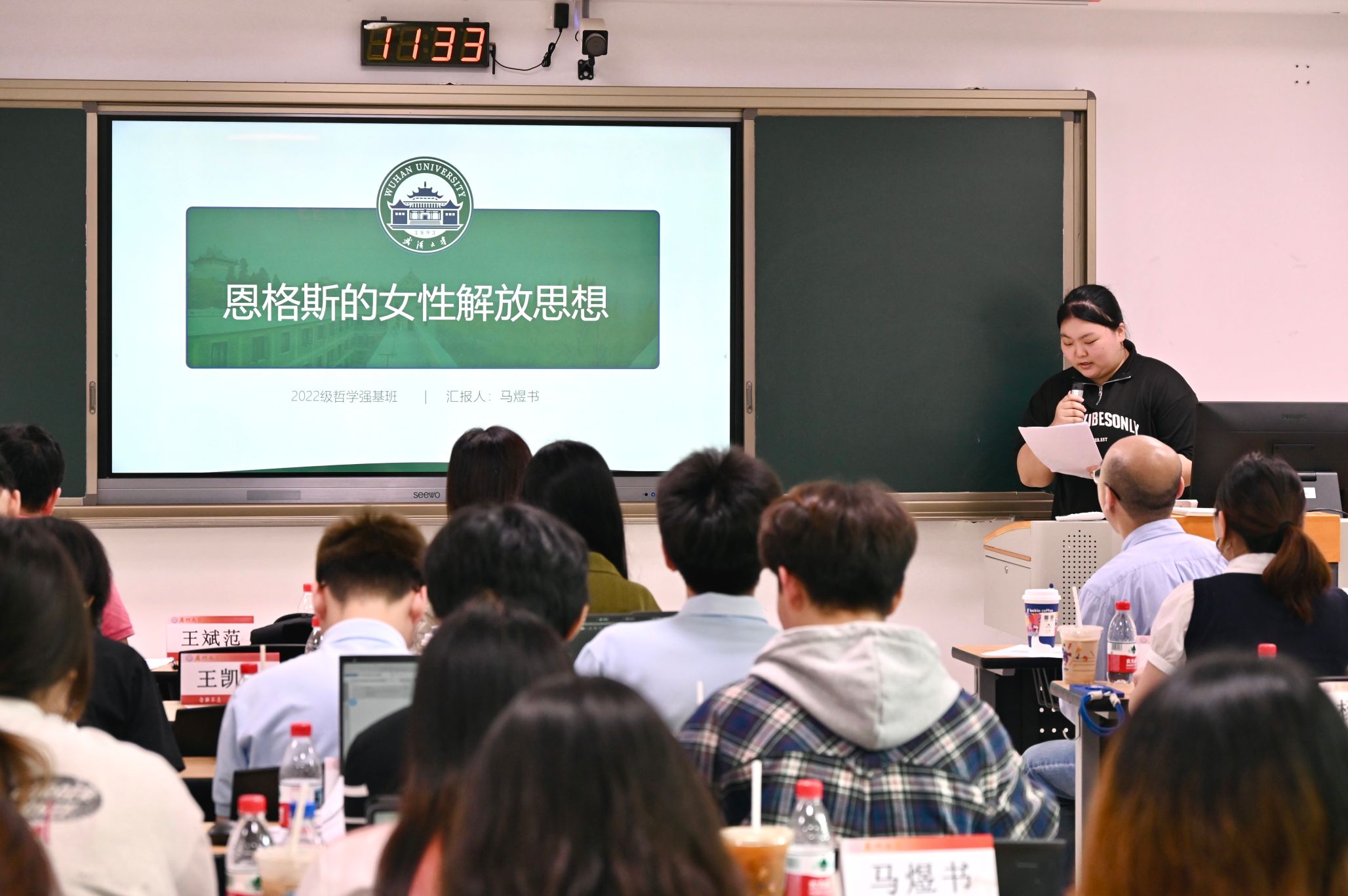 此次交流的核心环节是两校学生的学年论文互讲互评。作为新生,我们虽未直接参与汇报,但旁听学长姐们以哲学视角切入文学批评、科技伦理、美学现象等跨领域议题的讨论,深刻体会到哲学研究的现实关怀。厦大同学与武大同学对文本的阐释形成鲜明对话,让我意识到哲学研究既需要经典文本的深耕细作,更应直面现代社会的精神困境。尤其令我触动的是点评环节:双方师生以苏格拉底式的诘问推动思考深化,犀利而不失温情的学术交锋,展现出哲学人特有的理性克制与思想锋芒。这种“以问题为中心”的学术生态,启示我未来学习中既要筑牢形而上学根基,也要培养将抽象理论转化为现实解释力的能力。