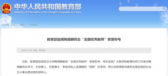 教育部追授陶德麟同志“全国优秀教师”荣誉称号