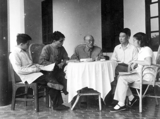 △ 陶德麟先生(右二)与李达老校长(中)等人在一起