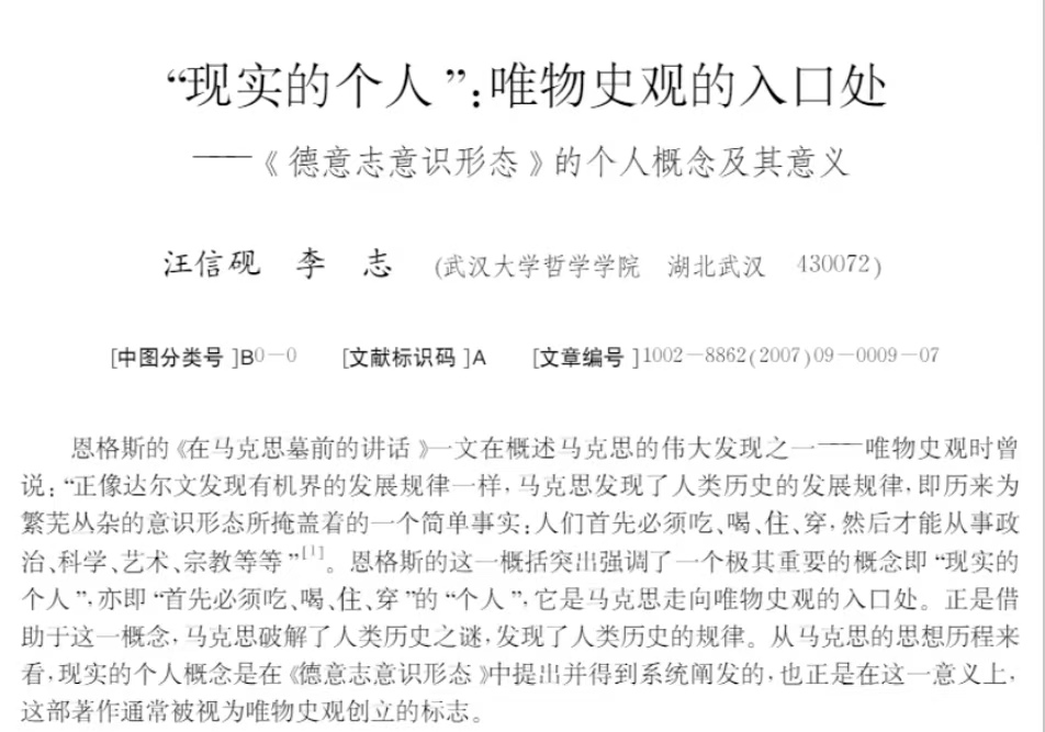 汪信砚、李志教授的《“现实的个人”:唯物史观的入口处——〈德意志意识形态〉的个人概念及其意义》一文发表于《哲学动态》2007年第9期。文章认为,“现实的个人”是马克思走向唯物史观的入口处,正是借助于这一概念,马克思破解了人类历史之谜,发现了人类历史的规律;从马克思的思想历程来看,“现实的个人”概念是在《德意志意识形态》中提出并得到系统阐发的,也正是在这一意义上,这部著作通常被视为唯物史观创立的标志。