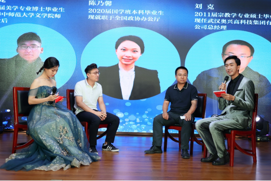 致敬青春,重温初心。本次庆典有幸邀请到了三位往届毕业生来为学弟学妹分享经验。他们分别是2011届宗教学专业硕士毕业生、武汉奥兴高科技集团有限公司总经理刘克,2018届美学专业博士毕业生、华中师范大学文学院师资博士后王海龙,2020届国学班本科毕业生、现就职于全国政协民族和宗教委员会办公室的陈乃馨。刘克学长和王海龙学长分别就职场发展和学术生活等相关问题与在场同学展开了交流,陈乃馨同学也以视频的方式分享了选调生工作的心路历程。