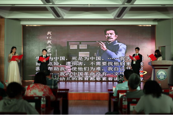 钟年教授讲话结束后,本科生丁晓晗、张锦悦、史云龙、唐宇姣为大家带来了诗朗诵《家书里的百年信仰》。跟随四位同学铿锵有力的嗓音和雄浑悲壮的背景音乐,在场的师生一同回顾了建党百年来中国共产党人和中国人民共同走过的峥嵘岁月。