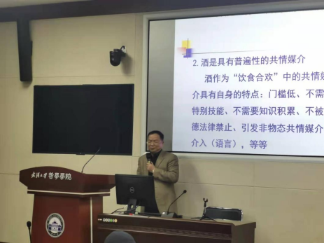 首先,李建华老师认为喝酒是一种生命体验的激烈方式,并指出酒是最接近哲学的一种存在物,很多哲学问题,比如感性与理性、真实与伪装、清醒与沉醉、灵感与顿悟等都可以在喝酒中有所体悟。同时,酒是具有普遍性的共情媒介,因为它门槛低、不需要特别的技能、不需要知识积累,并且能够引发非物态共情媒介的介入,比如酒后的语言表达。此外李老师还认为喝酒最接近生命的高峰体验,并以李白和李清照的诗作为例,指出善饮者比较适合从事文学、哲学、艺术类创作。