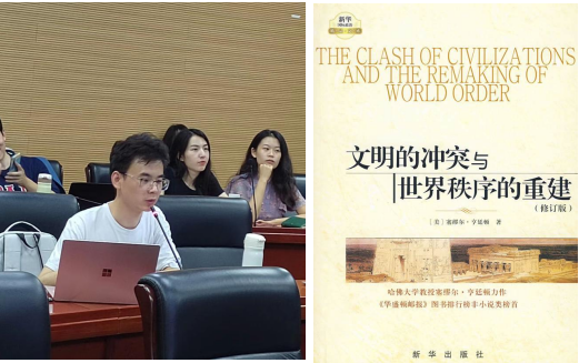在第一期读书会上,心理系硕士生王钲甫同学分享塞缪尔·亨廷顿的《文明的冲突》。王钲甫首先简要介绍了这本书的作者、主要观点、主要章节内容,然后引出本次读书想要与大家分享的三个话题:文明与普世文明、普世文明观念的后果、对普世文明观念的一些回应和对现代化的思考。