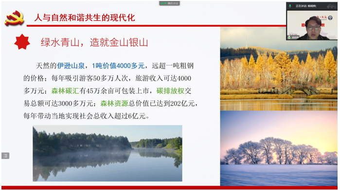 熊晓烨博士做了题为“以塞罕坝发展经验看中国式现代化本质特征”的专题宣讲。他首先解读了党的二十大报告中,中国式现代化的本质特征是人口规模巨大的现代化、全体人民共同富裕的现代化、物质文明和精神文明相协调的现代化、人与自然和谐共生的现代化、走和平发展道路的现代化。然后结合我国脱贫攻坚楷模塞罕坝,来分析塞罕坝发展经验如何体现中国式现代化的本质要求。