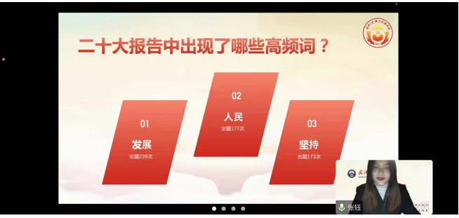 张钰博士做了题为“党的二十大报告中的高频次词语解读”的专题宣讲。她首先回顾了十九大报告的高频次词语,有人民、发展、建设、全面、坚持、实现等等。然后张博士重点讲解了二十大报告的出现最多的三个关键词,分别为发展、人民、坚持。她结合习近平总书记的经典表述与实事热点对这些词汇进行了诠释。如“江山就是人民,人民就是江山”、“人民至上,生命至上”、“党的伟大成就是党和人民一道拼出来、干出来、奋斗出来的”等。