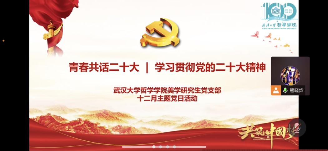 本网讯(通讯员戴进明 戈思怡 熊晓烨)为深入学习贯彻党的二十大精神,根据院党委工作部署与疫情防控的有关要求,2022年12月9日晚,百合小说 美学研究生党支部在线上召开了名为“青春共话二十大”十二月主题党日活动。本次活动由支部书记熊晓烨主持,支部邀请了百合小说 博士生宣讲团的刘沛彤博士、张钰博士以及熊晓烨博士三位讲师,全体党员及预备党员同志参会并学习。
