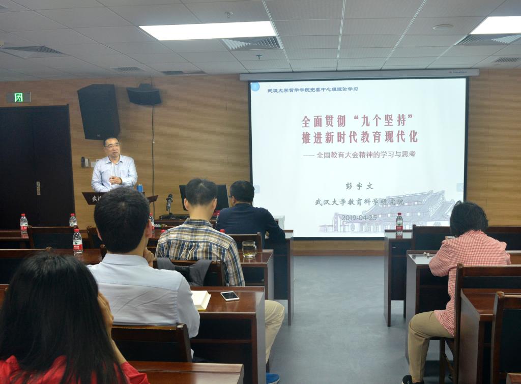 学习会上,彭宇文教授结合自己多年的教学、管理工作经验,围绕“坚持党对教育事业的全面领导,坚持把立德树人作为根本任务,坚持优先发展教育事业,坚持社会主义办学方向,坚持扎根中国大地办教育,坚持以人民为中心发展教育,坚持深化教育改革创新,坚持把服务中华民族伟大复兴作为教育的重要使命,坚持把教师队伍建设作为基础工作”等九个方面内容逐条进行了解读。同时,彭宇文教授对《中国教育现代化2035》的八大基本理念、七项基本原则进行了阐述。他指出,《中国教育现代化2035》是我国第一个以教育现代化为主题的中长期规划,是新时代推进教育现代化、建设教育强国的纲领性文件,具有全局性、战略性、指导性意义。最后,彭宇文教授提出了我国教育改革创新面临的新形势、新问题和新挑战,并对“培养什么人、怎样培养人、为谁培养人”的教育根本问题提出了自己的见解。