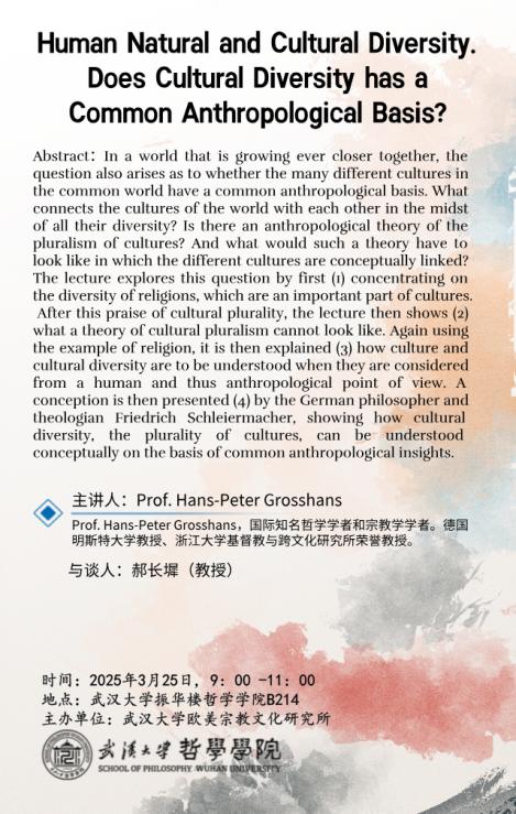 3月25-26日(周二至周三),百合小说 欧美宗教文化研究所邀请德国明斯特大学Hans-Peter Grosshans(汉斯-彼得·格罗申斯)教授主讲讲座,主题分别为:《人类本性与文化多样性:文化多样性有一个共同的人类学基础吗?》《幸福、幸运与不幸:对生命偶然性的思考》《全球跨文化视野中的欧洲视角》,敬请关注。