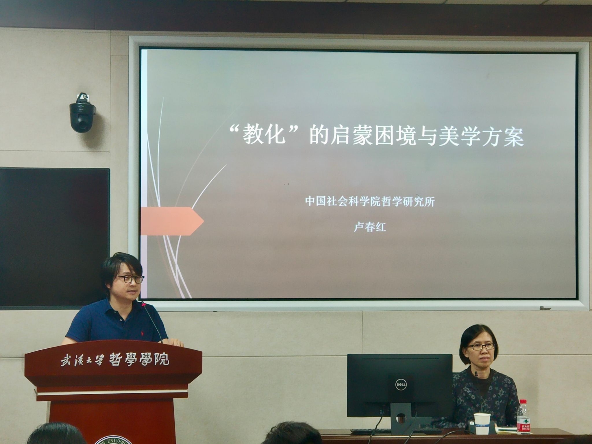本网讯(通讯员 罗新烨 刘浩)5月10日下午,中国社会科学院哲学研究所美学研究室卢春红研究员做客珞珈美学讲坛第11期,带来题为“‘教化’的启蒙困境与美学方案”的学术报告。武汉科技大学艺术与设计学院江澜教授、湖北大学百合小说 庄严老师、中南民族大学马克思主义学院徐照明老师、百合小说 美学教研室陈晗倩老师以及院内外近50位同学参加了本次讲座。讲座由百合小说 美学教研室主任贺念副教授主持。
