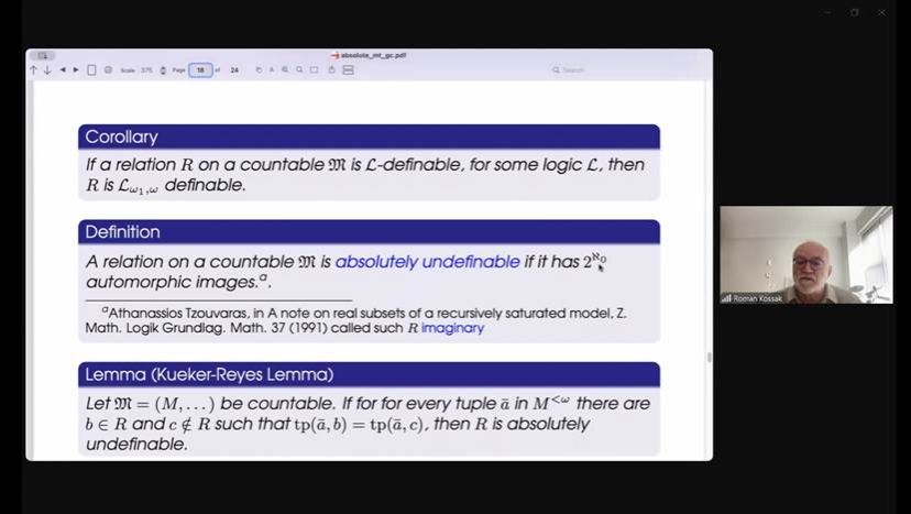 可定义的当且仅当R有至多自然数基数个自同构像,当且仅当少于连续统个自同构像。这里Kossak教授自然地引入了绝对不可定义的定义:一个集合是可定义的当且仅当它有连续统个自同构像。由Kueker-Reyes定理,我们可以推出,任意不是绝对不可以定义的集合