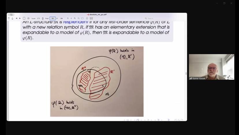 之后Kossak教授介绍了“荣美集(resplendence)”的概念。Barwise等人证明了一个可数集合是递归饱和的当且仅当它是荣美的。Kossak教授还给出了荣美集更多的性质,以及在分体论的应用。Kueker证明了在一个可数结构中,一个集合R是