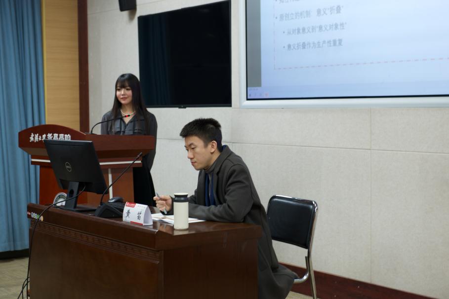 互动提问环节,就刘任翔老师提出的“与德国观念论传统中的‘直观’概念相比,胡塞尔对直观的拓展是否将其可错论化?”、“‘折叠’作为隐喻是否恰当、能否与‘外翻’同时成立?”,贺念老师提出的“胡塞尔与海德格尔范畴直观学说中,作为系词的Sein与作为存在谓词的Sein是否可以等同?”、“‘生产性重复’是否使得知性不再具有原初被给予性?”、王咏诗老师提出的“对于胡塞尔来说,数学与逻辑学的关系为何?”、“胡塞尔是否认为数学方式与概念推理方式可以被等同?”等问题,黄笛老师给出了精彩、细致的回应,并与在场老师们展开热烈的讨论。在场其他学生也积极参与,提出了相关问题,黄老师也做出了详细的解答。