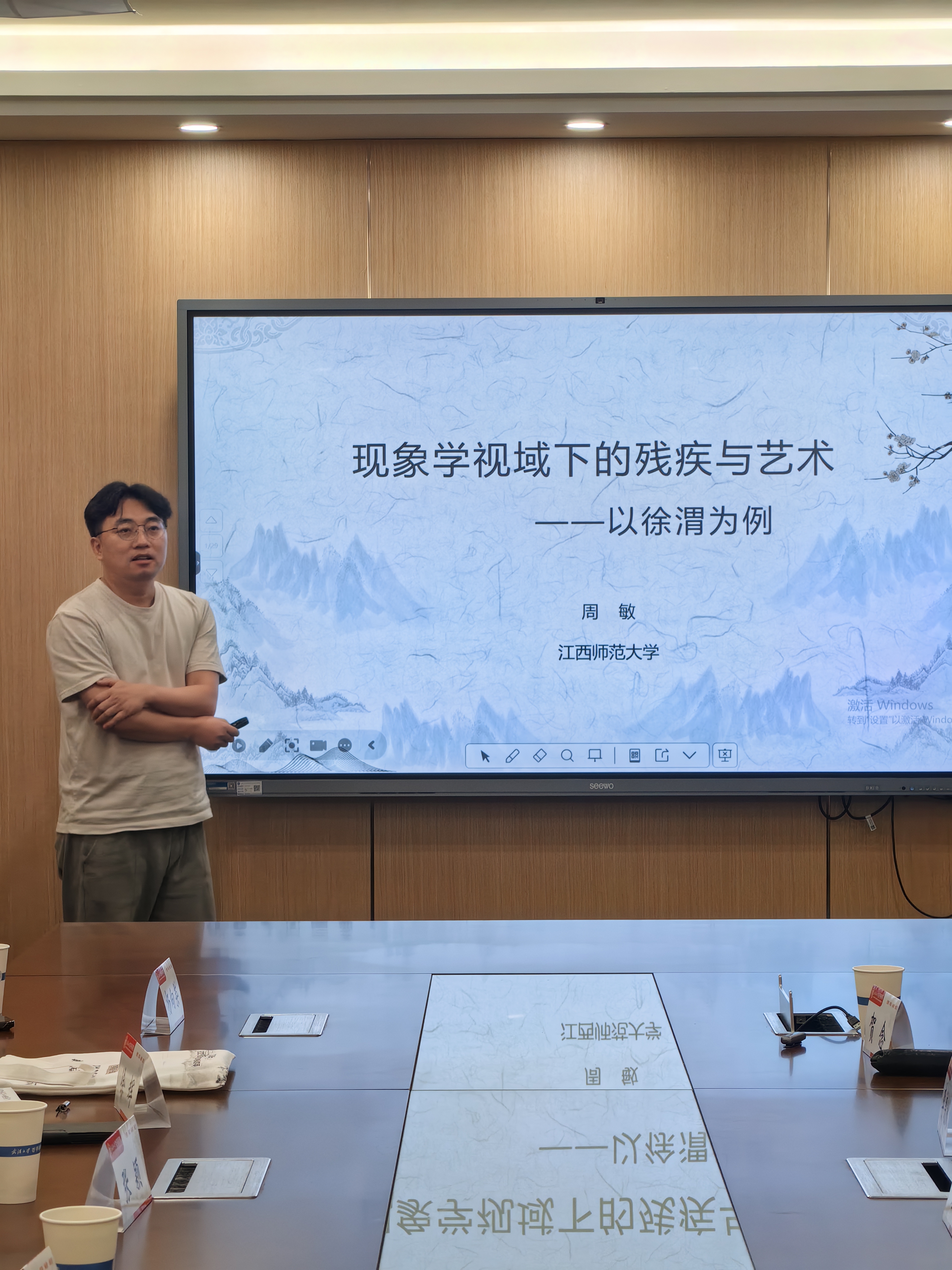 周敏老师第二个发言,他的题目为“现象学视域下的残疾与艺术:以徐渭为例”。周老师以画家徐渭的疾病与艺术之间为焦点,试图在身体现象学的视域下为理解徐渭的艺术表达提供一种新颖的理解进路。徐渭以“畸人”自谓,这种把原属于隐私的残疾变成公开使用的符号,具有强烈的自我象征意义。徐渭的“畸”不仅是社会边缘地位,更是其身体与世界直接、本真的交融状态,“畸人”作为身体经验的符号化表达,是其艺术独创性的根源。从现象学的角度来看,周老师认为应当区分“疾病书写”与“具身经验”,徐渭不仅是“书写”残疾,其艺术本身就是残疾具身经验的直接外化。徐渭的案例有力地证明,艺术创造绝非纯粹精神活动,而是深深植根于艺术家的具身化存在。残疾作为一种特殊的身体经验,并非艺术表达的障碍或背景,而是塑造其艺术知觉、表达方式和美学特质的核心中介力量。其“奇”源于其“畸”的身体图式。