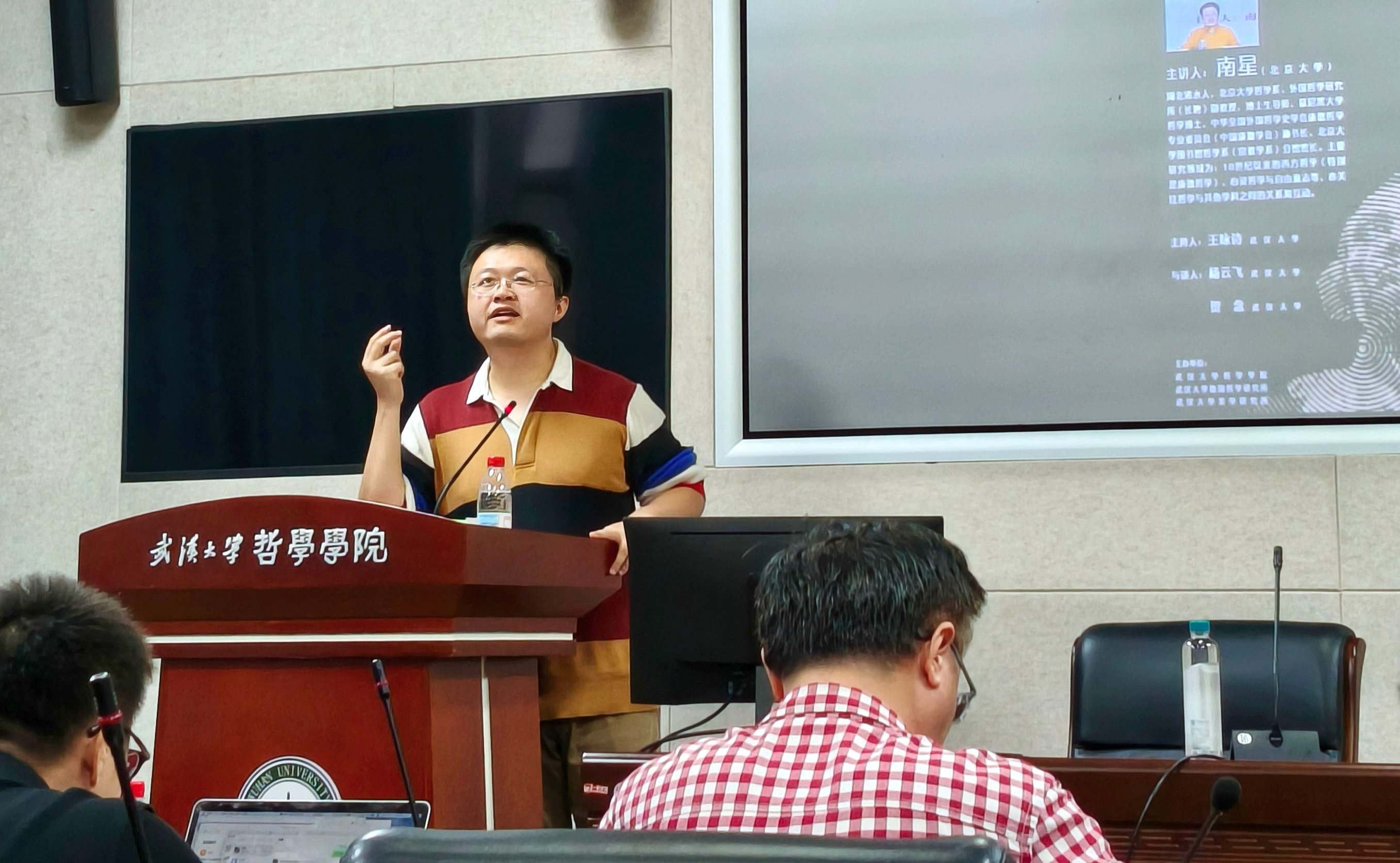 接下来校内外参与讲座的师生开展了热烈的讨论。华中科技大学的罗正东老师问及了体系哲学与哲学进步的矛盾性,南星回应这确实是一个吊诡,我们需要通过更加多元、动态的方式来探讨理性;此外,在座学生提问科学进步的直觉是否实际上是由技术进步造成的,又由谁来定义哲学的进步以及能否在非线性的、更宽泛的意义上理解进步等问题,南星都一一做出回应。整场讲座持续两个半小时,在主持人王咏诗对南星的精彩讲座以及在场师生的踊跃参与表示感谢后,讲座在大家的热烈掌声中圆满结束。