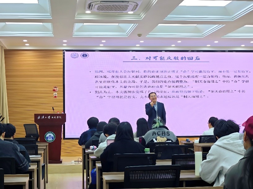 谢教授的讲座聚焦《荀子·天论》“从天而颂之,孰与制天命而用之”命题,主要从义理、语言学及学界研究评述等角度分析“命”字为衍文,提出该命题应为“制天而用之”。