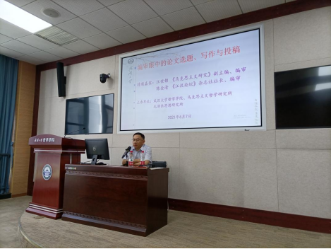 陈金清编审分析了综合性期刊与专业性期刊在选题要求上的不同,并为同学们介绍了国内核心期刊的分类、影响力评估方式以及期刊的审稿过程。他结合在《江汉论坛》杂志的工作实际,从五个方面谈了自己的看法:一是综合性期刊论文选题应当关注当代理论与实践中的重大问题,但要做实,切忌空洞;二是写文章要注意思想和观点的创新;三是分析论证时要注意逻辑的严密性;四是要注意语言表达的简要精炼;五是要注重学术规范。此外,他还结合自己的抗疫期间的阅读经历,鼓励同学们多阅读与专业相关的经典原著并做好读书笔记,这是写论文的前提和基础。