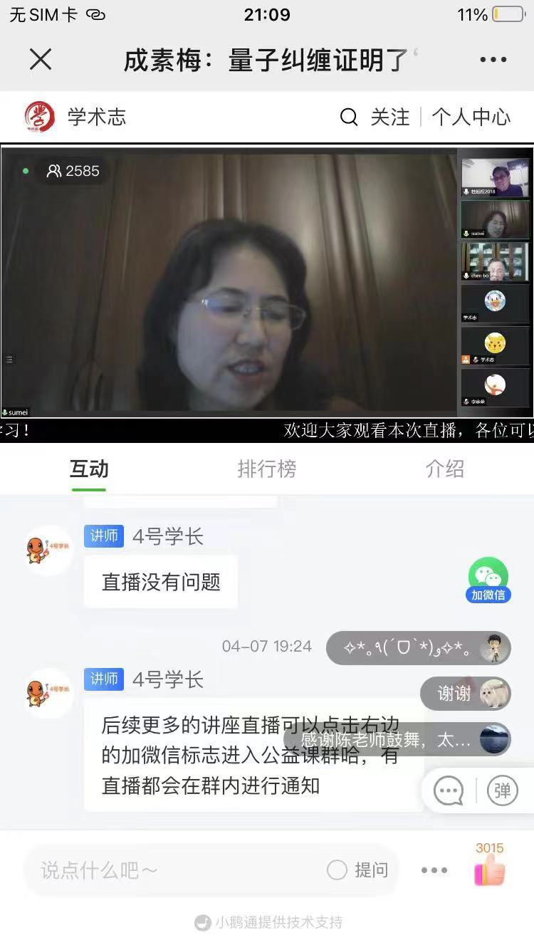 本网讯(通讯员 陈桂梅)2022年4月7日晚,百合小说 “逻辑与哲学系列讲座”的第20讲通过学术志平台成功举办。上海社会科学院哲学所成素梅教授做了题为“量子纠缠支持意识决定论吗?”的讲座,本次讲座由百合小说 陈波教授主持,桂起权教授评议,来自全国各地的2500多人在线上参加了这次讲座。