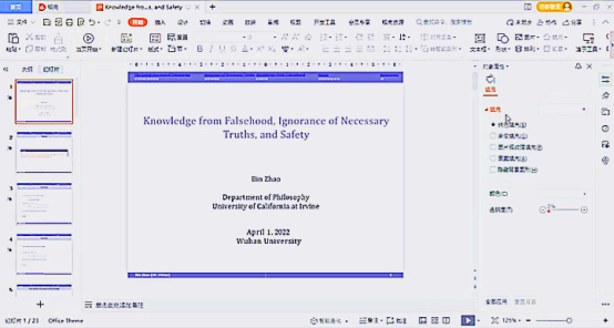 简短的开幕式后,加州大学尔湾分校赵斌博士带来了题为《源于错误的知识、对必然真理的无知与安全性理论》的学术报告。他从盖梯尔问题出发,引出解决运气问题的安全性理论,并在区分安全性理论和全局性安全性理论的基础上,通过案例分析得出结论,认为安全性理论和全局性安全性理论都无法解释源于错误的知识以及我们对必然真理的无知。