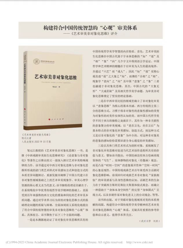 该书的出版,对于突破对象化视域来对美的本质理解的局限,构建符合中国传统哲学美学精神的艺术审美非对象化思维的“心观”体系,无疑具有重要的参考价值和启示意义,值得学术界关注。