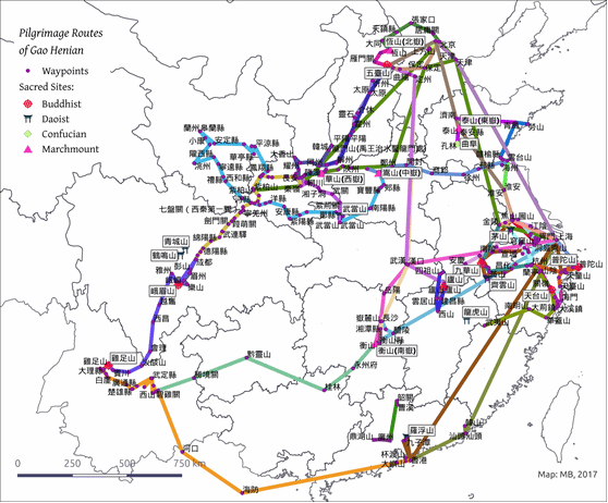 高鹤年每到一地便会把出发或到达的时间、地名写出来,并把两地之间的距离也会以“里”为单位作标识,例如“(光绪二十年,1894)十一日,出西门,乘夜行船。十三里,四安塘。五十里,顺林桥。……十二日,黎明,上岸陆行。四十里,思安镇。五十里,广德州,宿。途中多山。十三日,微雨”[1]。有时顺带会把旅行方式以及当日的天气等信息一并列出。在制作地图技术不发达,且普通人难以掌握的情况下,这实际上是通过文字的形式为其他行脚、朝山者提供更多的旅行信息。通过高鹤年提供的这些信息,我们可以通过数字化技术还原他曾经大致游历的地方和路线(如下图),展示近代佛教徒行脚的网络。也可见高鹤年的游记有着明确的“读者意识”,他的目的是为佛教信众提供“行脚人之指南”。[1]
