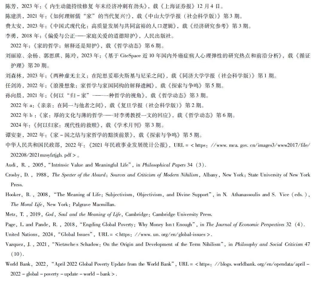 如前所述,支持家哲学和反对家哲学的学者很多,而聚焦于虚无主义来讨论家哲学的学者并不多。作为家哲学的代表之一,孙向晨旗帜鲜明地指出,对抗虚无主义是支持家哲学最重要的理由之一。他详细论述了“归家”何以拯救“虚无”。在孙向晨看来,不管是在儒家传统语境下,还是在广义的中国传统文化语境下,甚至是在全球语境中, “家”都具备“作为人类生存的根基性、普遍性、结构性的特点”,“对于人类生存的不可或缺性以及结构的独特性” 。(参见孙向晨,2024年,第23页)孙向晨认为,家哲学有本体论、价值论和生活世界三个层面。在本体论层面,家作为人类社会的一个基本结构和最小单位,是一个“生存论”意义上的事实。在价值论层面,家作为一种理想模型,构成了我们现实生活的坐标。在生活世界层面,家揭示了“世界的温暖性面向”。“亲亲”作为家之本,以及“生生”、下一代的成长,则可以克服我们对死亡的普遍焦虑,“这是一种基于生命连续性的‘希望哲学’” 。(参见孙向晨,2022年,第31页)