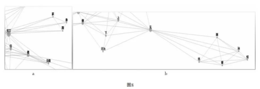 当然,以上所见仅是《论语》中多个动态网络之一,还不够有代表性。但当AI进一步为《孟子》《礼记》单独绘制其概念网络时,会发现“德”概念远离儒家道德词汇社区的情况出现在所有动态网络存在交集的重叠网络中,这就显示出模式化的普遍性。比如,在“仁”作为核心节点的概念社区中没有“德”(7a),“德”亦不在“礼”所关联的概念社区中(7b)。此外更极端的情况是,在《孟子》所有的概念网络中,“德”都未作为独立节点出现,在《礼记》中,“德”也只在一个聚类簇的概念网络中出现。
