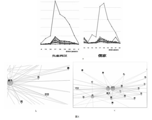 在说明这一点之前,先要指出的是,对道德领域的高度重视构成了早期儒学的一个识别性特征。因此在调用“齐物智算”模型对《论语》《孟子》《礼记》的全部文本进行聚类并观察思想元素的分布曲线时,会看到一个差别:在先秦两汉文本中,政治类思想元素(索引18)权重最高,但在儒家典籍中关涉道德修养的思想元素(索引17)权重最高(图5a)。因此在语言模型进一步构造儒家论“德”的动态概念网络时,会发现在不少网络中与“德”关联最为密切的不是“天子”“君臣”“天下”等政治语汇,而是作为儒家理想道德人格之表征的“君子”(图5b)。尤其值得注意的是,有些网络所见,即便儒家专门谈论政治领域时,也仍然是“君子”“仁”“义”等道德语汇的权重更高,因为它们与“天下”这一政治语汇在概念网络中比“德”距离更近。而更值得注意的是,“德”并未与这类道德语汇构成直接联系(图5c),这或许意味着“德”并没有完全嵌入儒家的道德语言。
