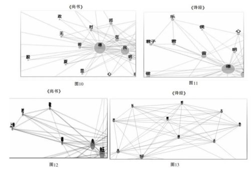 这里主要选择最具代表性的《尚书》和《诗经》。在其动态网络中,“德”一方面与“君”“候”“政”“邦”“民”等政治语汇构成概念社区,同时与对声音和亮度的修辞密切相关(图10、图11)。这正表明“德”是被描述为政治领域中可展示的东西,如执政者的好品行。但这种被展示的“好品行”并不属于道德范畴,而是政治范畴,因为“展示”的目的不是面向自我人格的完善,而是面向他人。如果这一“展示”的功能是获得认同,则意味“德”能使执政者具有影响他人的无形力量,而这或许就应当被看成古典语境中的权力,正如前引《诗经》所见的,“德音”的展示对应于天子的“威仪”。由此入手,就能真正理解周人对“德”的重视。如在《尚书》的一个动态网络中(图12),“敬德”或重视“德”一方面关联于“上帝”,一方面关联于“先王”,二者在周人的政治意识中正是权力的来源,因此要求执政者“敬德”与其说是完善自我人格,不如说是巩固权力。是故,在之前从早期中国思想文本提取的背景概念网络中,“德”与“文王”的连接也能得到解释,即作为概念节点的“文王”不仅是特定的历史人物,更是权力来源的人格表征。所以在《诗经》的动态网络中(图13),“德”不仅关联于“声”“色”“明”等展示方式,更直接关联于文王,这意味“德”作为执政者通过“展示”而能影响他人的力量,正是继承自文王的权力: