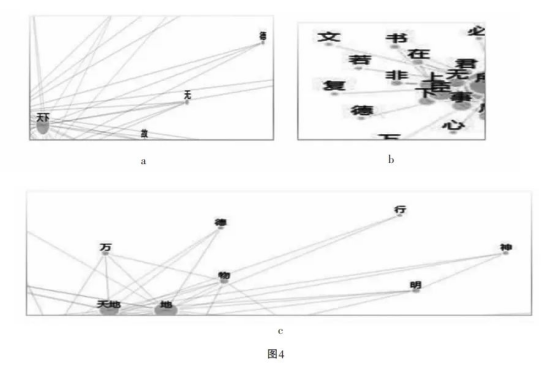当然,在由AI计算的先秦两汉文本的所有聚类簇中,“德”概念在不同的动态网络中关联于不同的概念。但典型仍然是与“天下”“君臣”“上下”等政治语汇相连接(图4a、4b)。至于“德”与“天地”的连接(图4c),看似不在政治语境中,但在后续建构的道家文本的概念网络中,这种连接正与道家对执政者建议的“无为”密切相关。