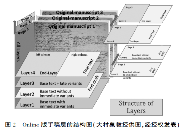 Online版编辑小组正是根据MEGA2系列版本对即时异文和后续异文的判定,将《德意志意识形态》“费尔巴哈”章手稿的创作过程严密地区分3-4次的改稿过程,并为每一阶段的改稿设定了独立的Layer(改稿层),利用不同的颜色和字体将改稿过程中的异文依据其产生的先后顺序复原到各个Layer的正文中。Online版再现的改稿过程如下:马克思恩格斯在手稿左栏写下的基底稿(Layer1[内含即时异文]、Layer 2[基底稿或第一稿])→恩格斯对基底稿进行的修订(Layer3.1)→马克思的改稿(Layer3.2)→马克思将部分论述挪用到第2章或第3章时的改稿(Layer3.3)→恩格斯和马克思对手稿的再次修改(Layer3-Ende)→最终文本(Layer4-Schlussfassung)→全部文本(All Layers)。