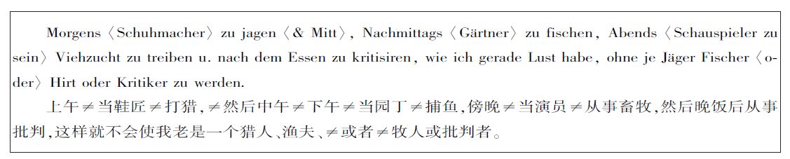从MEGA2第I/5卷的原文中可知,“上午≠当鞋匠≠打猎,≠然后中午≠下午≠当园丁≠捕鱼,傍晚≠当演员≠从事畜牧”这一文本中,被删改的只有“≠当鞋匠≠、≠然后中午≠、≠当园丁≠、≠当演员≠”等部分信息,但依据汉译广松版的异文,“≠当鞋匠【然后中午】下午当园丁、傍晚当演员、[随心所欲地]≠”整个一句话像是被马克思恩格斯删除后,又重新写下了“下午捕鱼,傍晚从事畜牧,然后晚饭后从事批判”等内容。此处广松版的汉译本虽然如实翻译了广松版复原的异文标记,但与手稿本身的记载有较大的的偏差,承袭了阿多拉茨基版中的错误。另外,此处马克思恩格斯为何要将“鞋匠、园丁、演员”等名词改为“打猎、捕鱼、从事畜牧”等动词,原因正在于二人所批判的社会分工,主张在共产主义社会中扬弃拘泥于固定社会职业中的异化劳动。
