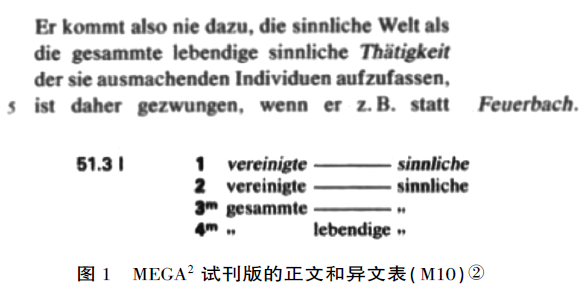 MEGA2试刊版在编辑手稿时采用左右两栏的编排方式,将马克思恩格斯在改稿过程中写在右栏的独立边注按手稿原有的记载状态排印到了右栏,除此之外,还首次在学术附属资料卷的异文表中独创标行标记法,详细地复原了稿内异文。如手稿第10页中的一处修改,马克思恩格斯在此处批判了费尔巴哈只是将人理解为抽象的感性对象,没有从生活关系的维度去把握个人的感性活动,去理解活生生的个人。MEGA2试刊版的最终文本为Er kommt also nie dazu, die sinnliche Welt als die gesammte lebendige sinnliche Thätigkeit der sie ausmachenden Individuen aufzugassen(因此,他从来没有把感性世界理解为构成这一世界的个人的全部活生生的感性活动)。异文表中“51.3 L”代表此处异文对应正文卷第53页第3行左栏的修改,斜体表示马克思恩格斯标上下划线以示图1MEGA2试刊版的正文和异文表(M10)强调的字句。根据并行排列中的异文标记,马克思恩格斯在写成die gesammte lebendige sinnliche Thätigkeit(全部活生生的感性活动)之前,至少修改了三次。由第1行可知,恩格斯最初写在左栏基底稿中的是die vereinigte sinnliche Thätigkeit(联合起来的感性活动),基底稿写就后,恩格斯修订时删掉了标在vereinigte sinnliche下方的下划线。第3行的上标m表示马克思的改稿,其第一次改稿时将vereinigte(联合起来的)改为gesammte(全部的), 第二次改稿时在gesammte和sinnliche之间补写了lebendige(活生生的)。这就是die vereinigte sinnliche Thätigkeit到die gesammte lebendige sinnliche Thätigkeit之间的成稿过程,马克思将感性活动的定语“联合起来的”最终改写为“全部活生生的”。