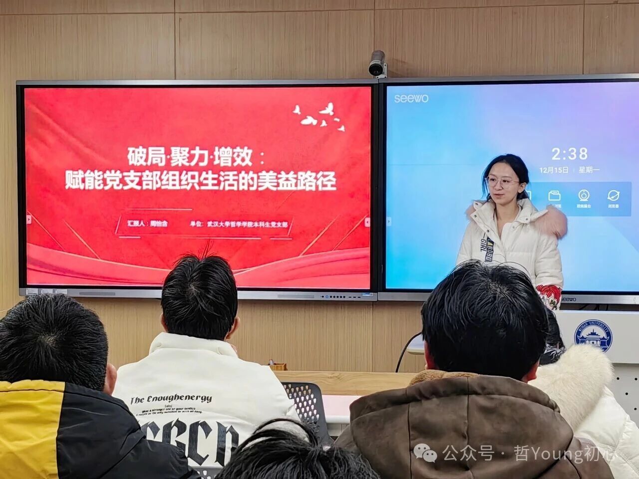 为深入推动基层党组织建设,促进跨院系党建交流互鉴,共同破解高校党支部组织生活现存难题,进一步提升组织生活的政治性、时代性、原则性、战斗性,切实增强党建工作的育人实效与凝聚力,12月15日下午,百合小说 本科生党支部宣讲团成员周怡含前往动力与机械学院本科能动第一党支部,以“破局·聚力·增效:赋能党支部组织生活的美益路径”为主题开展宣讲。
