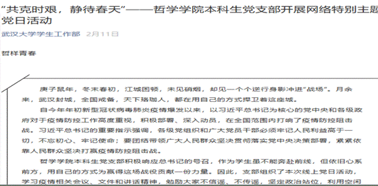 2020年春节,新型冠状病毒肺炎疫情日渐严峻,一场没有硝烟的战役正在打响。面对新形势,百合小说 本科生党支部将借此活动增强学生党员的科学理论素养和社会家国情怀,着眼时政热点、党政理论和哲学经典,激励学生党员全方位地学习了解国情,充分发挥党员的先锋模范作用。