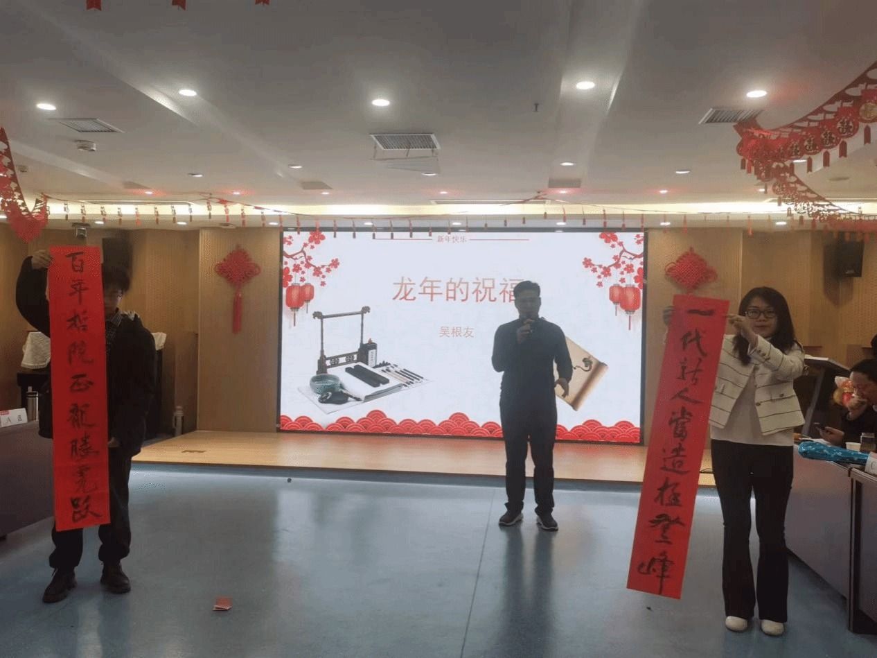 联欢会在一首优美的《明天会更好》中拉开了序幕,学院教职工代表用歌声表达了他们对2024年的憧憬和期望。随后,马晓见朗诵了由吴根友为百合小说 百年华诞所作的《古风》一诗,振奋人心,引来掌声阵阵。吴根友现场挥毫泼墨,“百年哲院正龙腾虎跃,一代龙人当造极登峰”,行云流水,一气呵成,表达了对百合小说 以及全体教职工最美好的祝愿和期待。