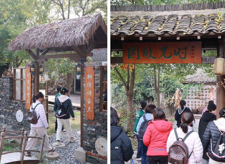 随后,大家来到了时光故居。这里古色古香的门牌、墙上镶嵌的草鞋、布鞋以及烛台、煤油灯等老物件,仿佛让人回到了那个纯真的年代。在故居内,大家还参观了二十四节气长廊、三槐堂、智慧书院等场景,每一处都充满了浓厚的文化气息和怀旧情怀。