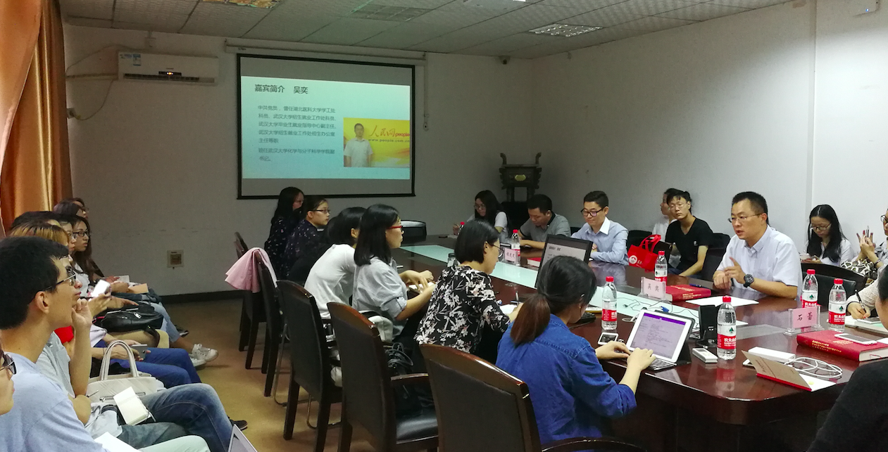 化学与分子科学学院副书记吴奕结合自身经历为基础,为备考辅导员的同学提前进入角色提供了详尽的建议。吴老师指出,做学生工作要有爱心和激情;要有责任和担当,有自己的主见;同时要保持虚心向领导、同事、学生学习的态度;要善于分清主次,抓住重点,争取一切资源着力解决主要矛盾;注意以问题为导向,从实际需求出发展开行动;大处着眼小处着手地处理事情;最后,吴书记鼓励同学们调整备考心态,知己知彼准确定位,展现自身素质。