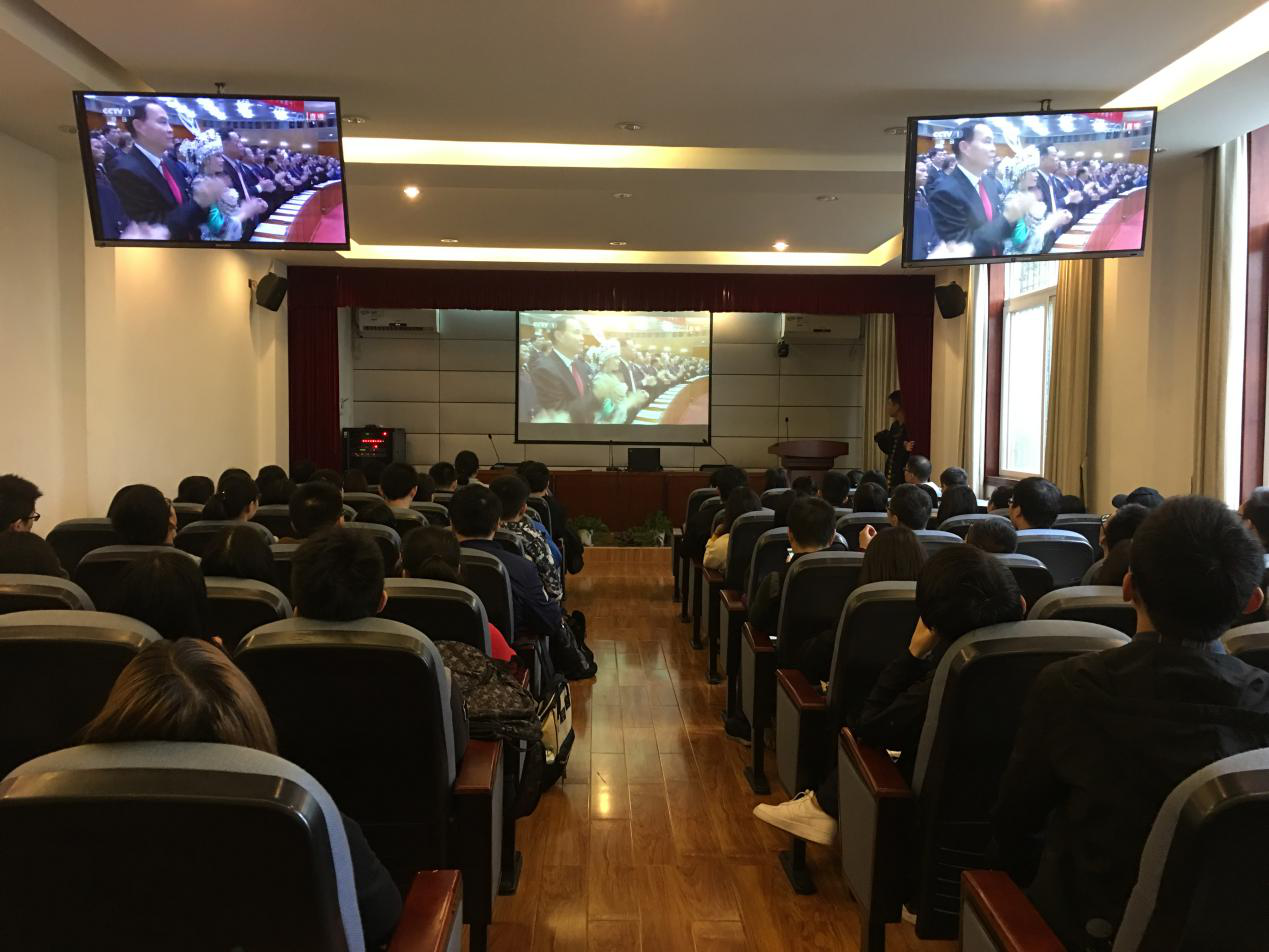 10月18日上午8时40分,百合小说 的同学们早已在学院内集结完毕,分队前往百合小说 大报告厅和政治与公共管理学院报告厅认真观看十九大开幕会直播。
