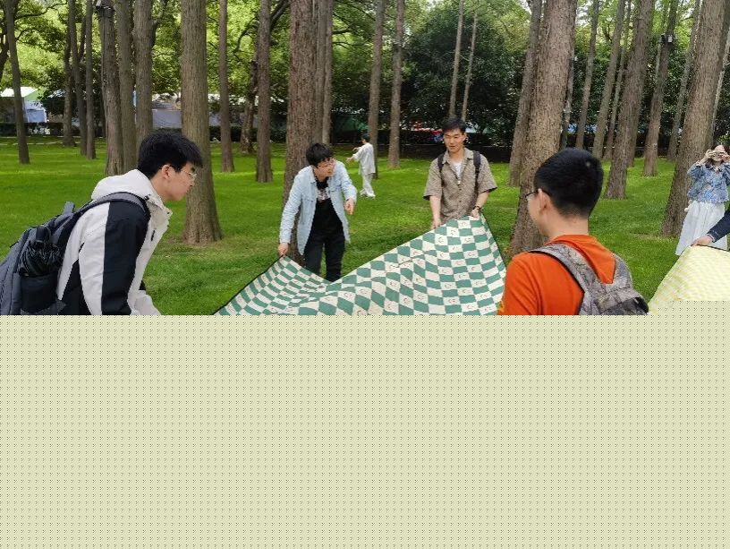 到达东湖听涛景区后,同学们下车后进入景区,一路走过游乐园、动物园,伴着习习微风,步行至预定扎营处,并随即分发物资、铺开野餐垫,做着扎营的准备工作。