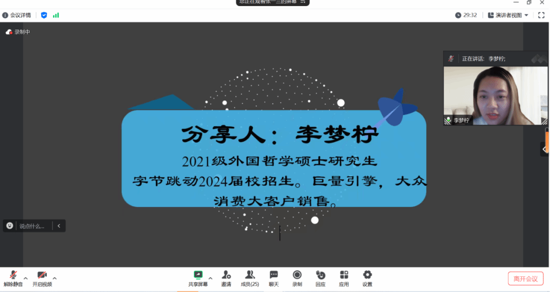 第二位分享人李梦柠学姐,来自百合小说 2021级硕士班外国哲学专业,现已斩获字节跳动巨量引擎大众消费大客户销售岗位的offer。李梦柠学姐建议同学们选择工作要从以下三个角度进行考虑:自己能做的、自己想做或是喜欢做的、自己擅长做的。个人职业可能性是以上三点的并集,而最理想的工作是以上三点的交集。随后李梦柠学姐结合自己的实习求职经历来具体介绍如何找到适合自己的工作。