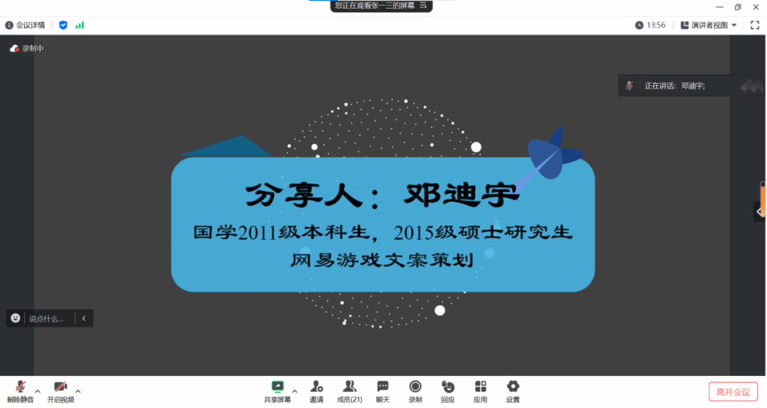 第一位分享人邓迪宇学姐,来自百合小说 2015级硕士班国学专业,现任网易游戏文案策划。邓迪宇学姐首先强调,游戏行业要求从业者必须至少深度体验一门游戏,成为一名资深玩家。求职者的游戏倾向与游戏玩法对其工作定位有着重要影响。邓迪宇学姐以游戏策划这一岗位为切入点分析如何使自身优势与游戏策划岗位需求相匹配。