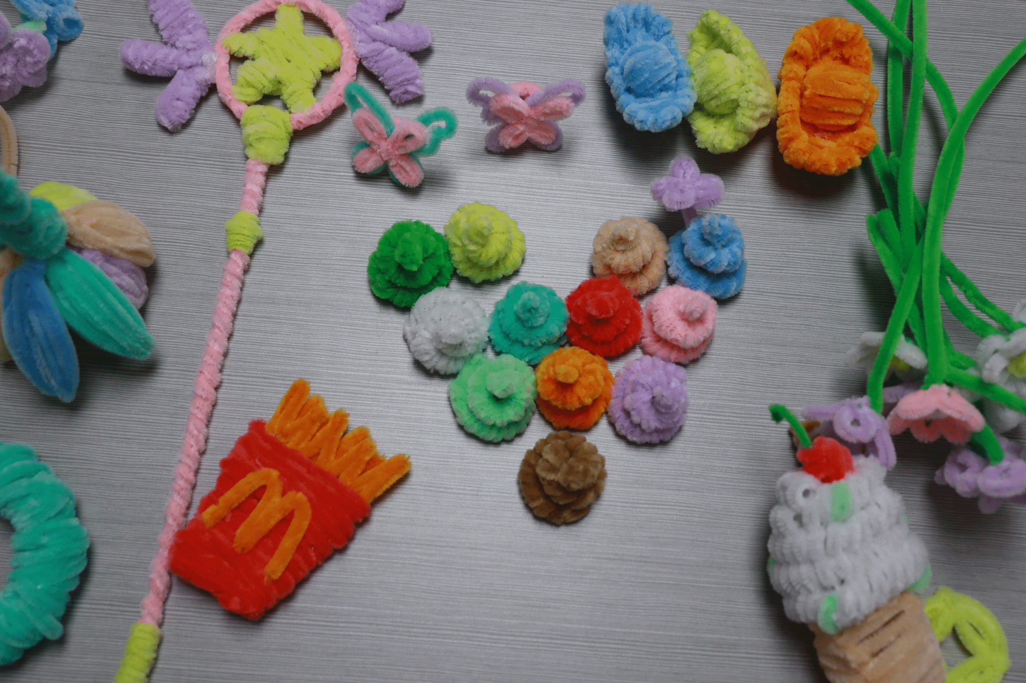 许多同学展现出了惊人的创意和手工天赋。一位同学利用扭扭棒制作了一束灿烂盛开的铃兰花,柔和的线条和明快的颜色让人赞叹不已。另一位同学则巧妙地将扭扭棒扭成了一只冰淇淋,丰富的细节和自然的形态引来众人称赞。