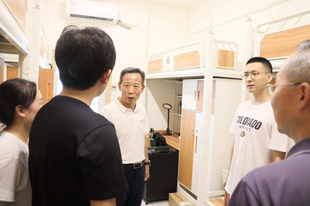 报到结束后,党委书记卢昌宁、党委副书记严璨、副院长黄超来到学生宿舍看望新同学。卢昌宁对新生的到来表示祝贺和欢迎,勉励新生要树立远大理想、注重品德修养、积极参与实践,用实际行动诠释新时代青年的责任与担当。严璨详细询问了新生的入住感受和生活需求,叮嘱新生要劳逸结合。黄超鼓励新生尽早明确个人发展方向,珍惜在校时光。
