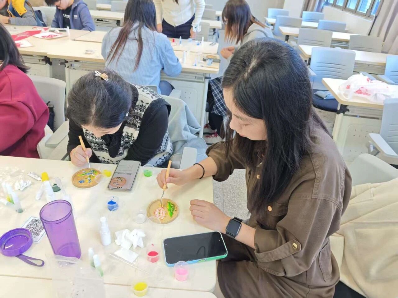 掐丝珐琅杯垫体验区中,铜丝弯折、釉料填充的操作充满挑战,同学们先对照模板勾勒轮廓,用镊子将铜丝弯成对应纹样粘贴固定,再挑选喜爱的釉料填充空隙,过程中反复调整铜丝弧度、校准釉料厚度,工作人员耐心讲解防潮处理、色彩搭配技巧,帮助解决填充不均、铜丝脱落等问题,最终一件件色彩鲜亮、纹样精美的珐琅杯垫新鲜出炉,尽显传统工艺的绚丽质感。